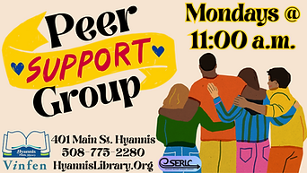 Our new Peer Support Group at 11am on Mondays at the Hyannis Library is a welcoming space for connection, reflection, and peer support. This group invites individuals of all backgrounds to come together, share experiences, and build resilience through conversation and mutual understanding. Whether you're navigating recovery, seeking emotional support, or simply looking to connect with others in a safe and affirming environment, this group offers a place to be heard and valued.